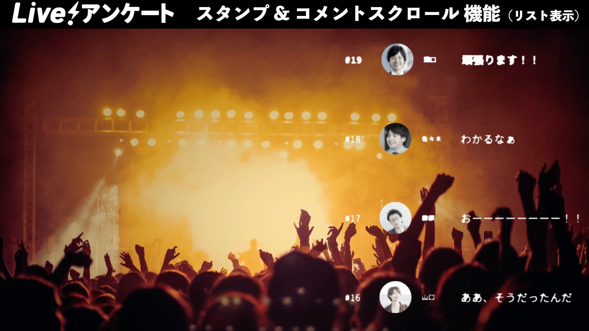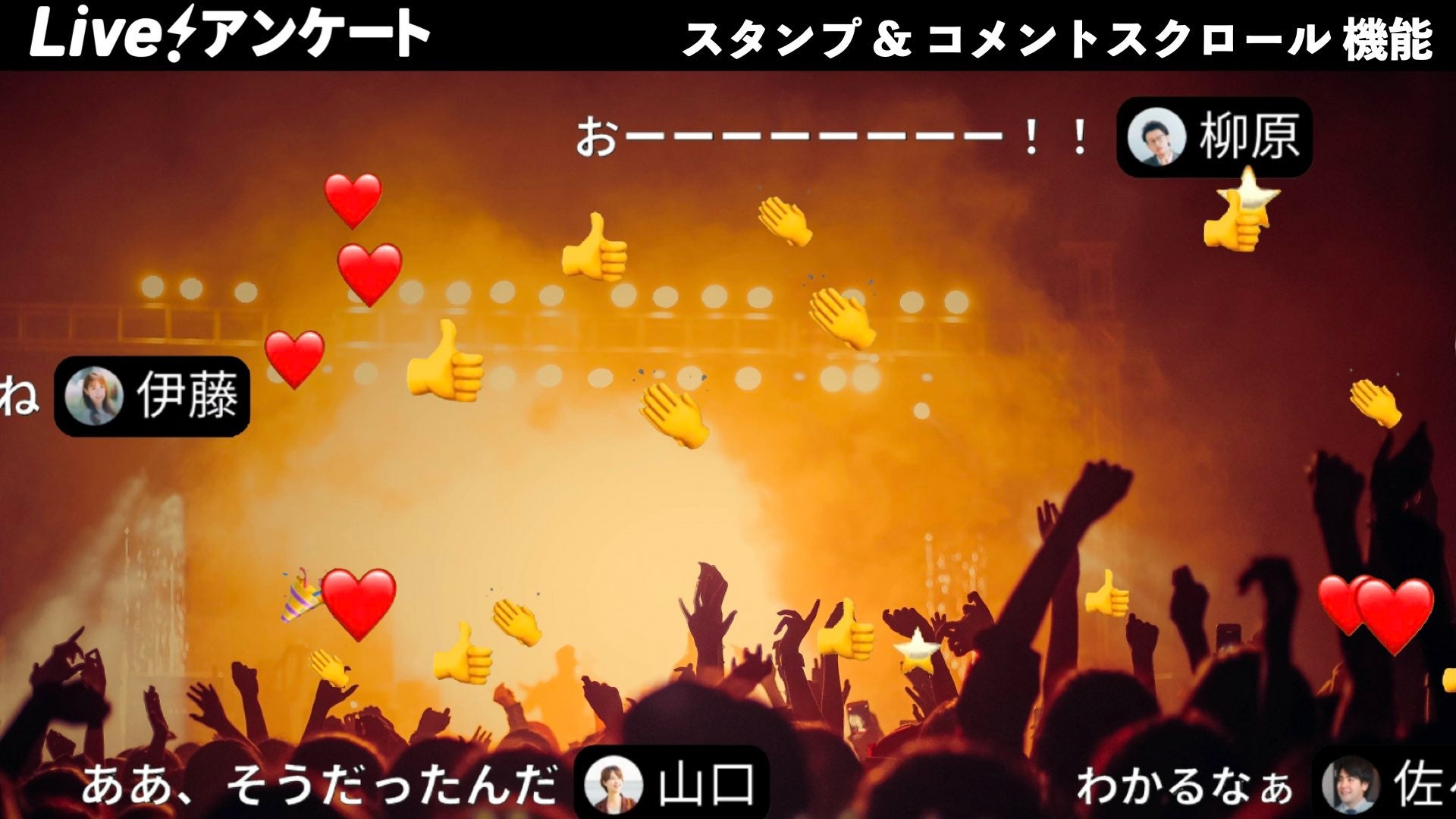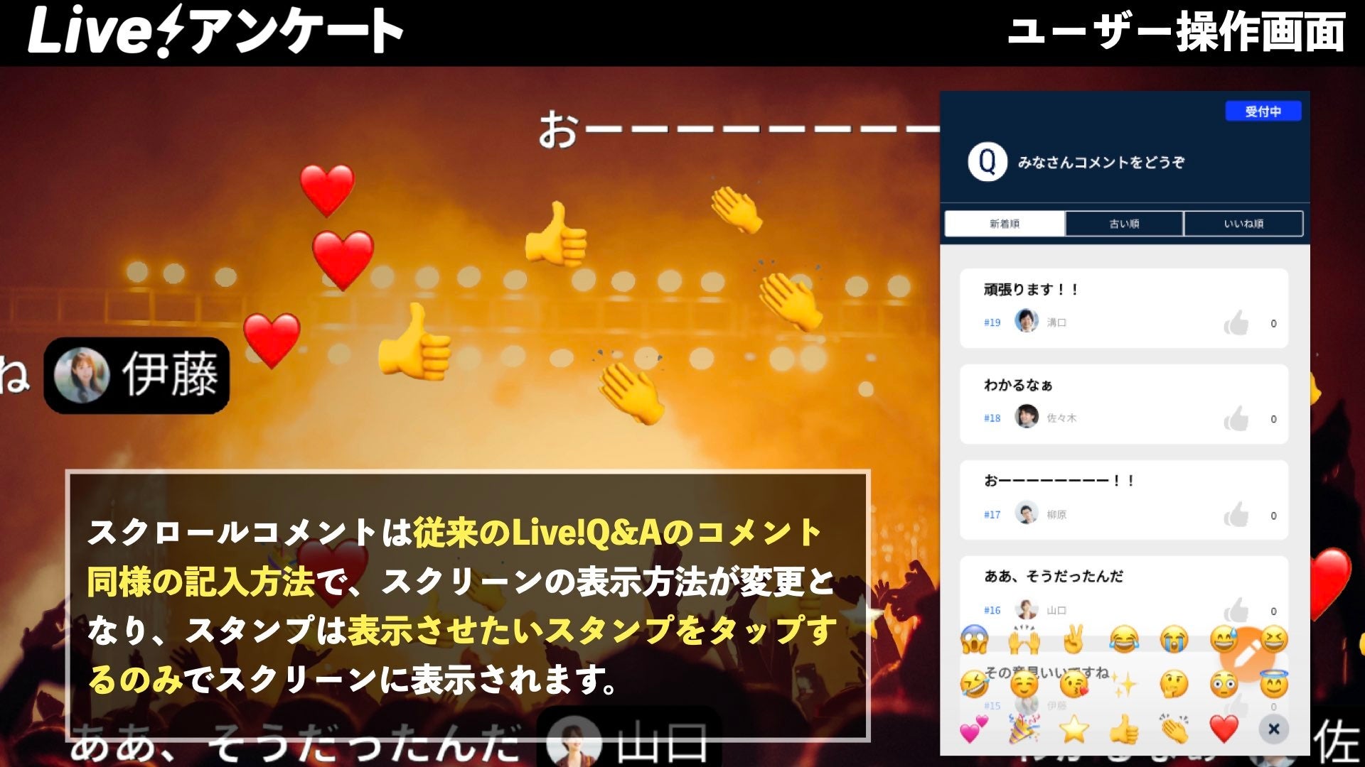 今回の新機能は、参加者が感情を絵文字のみでリアクションしてイベントに参加する「スタンプ」機能、更には固定表示ではなく、スクロールされることでコメントの希少性や価値観を高める「コメントスクリーン」機能の2つの機能追加となっており、これまで以上にLive!アンケートを活用したイベントを盛り上げていく為にリリースされた機能となっております。