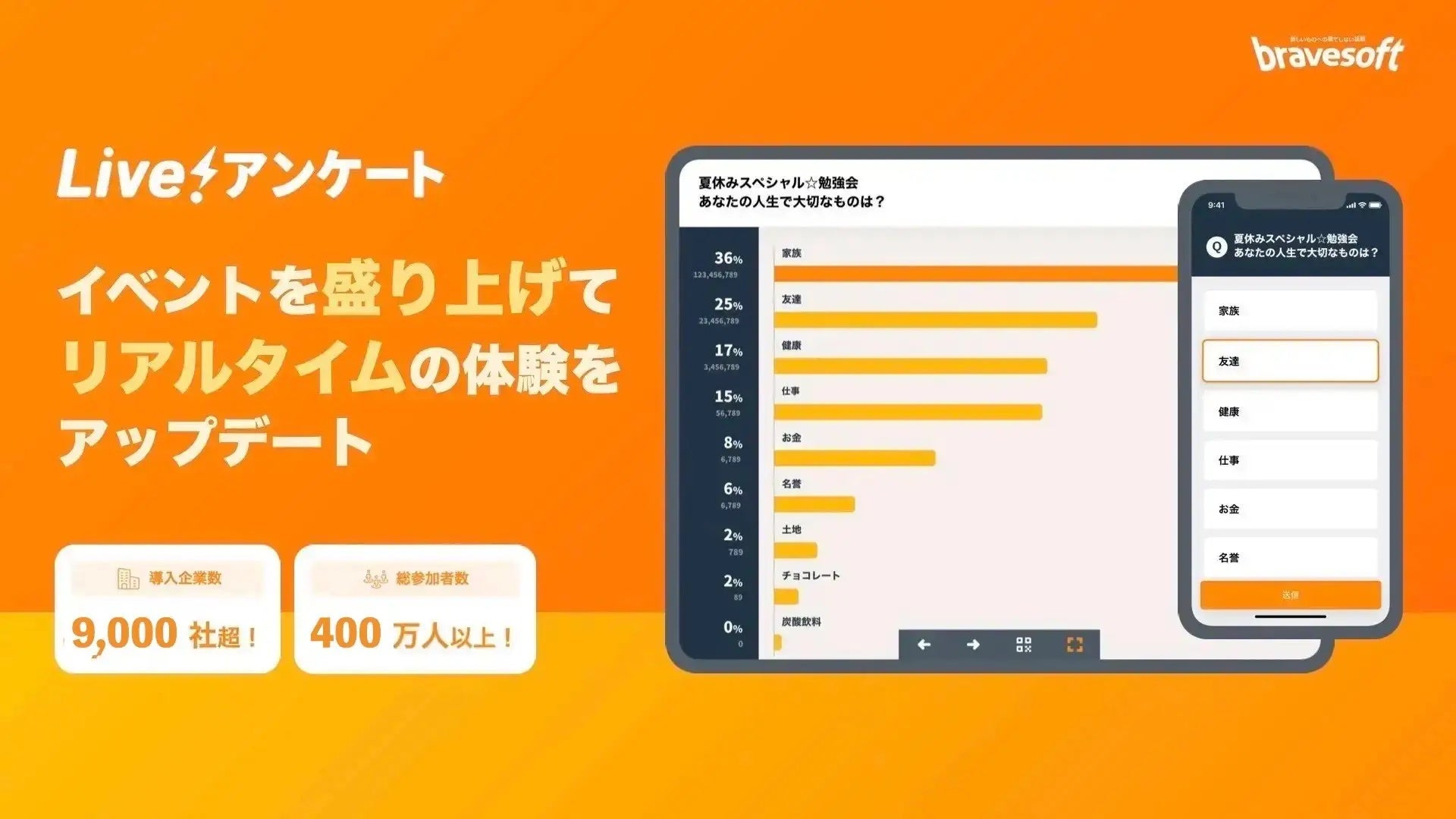 Live!アンケートは2019年7月のリリースから3年が経過し、オンラインイベント・リアルイベントの形式を問わず多くのシーンでのリアルタイム投票やリアルタイムアンケートでイベントの付加価値を高め、リリースから3年で9,000社への導入、400万人のユーザー体験を実現しております。