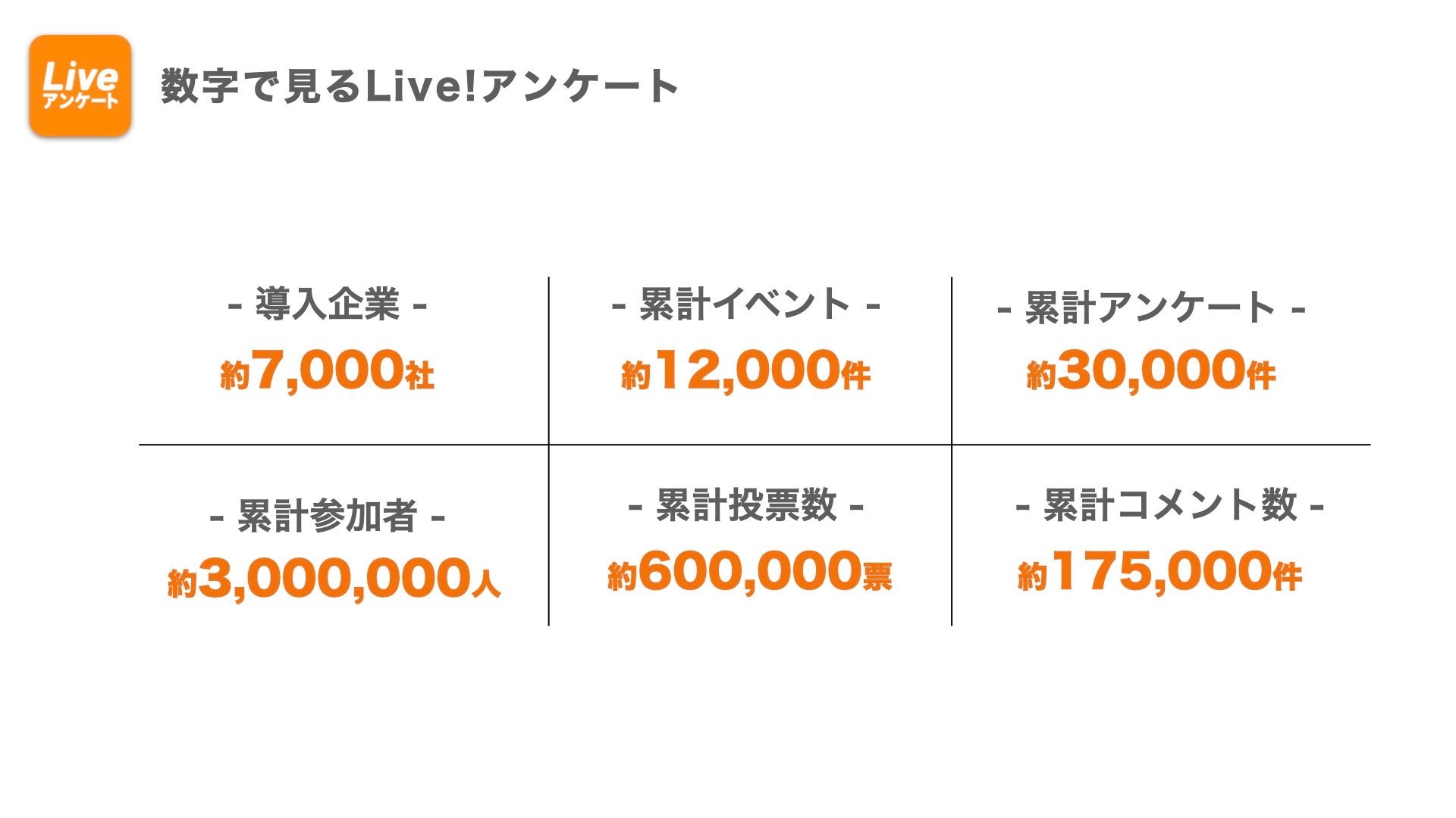 Live!アンケートがこの3年で導入企業数7,000社を超え、累計の参加者も300万人を超え、大変ありがたいと感じております。ひとえにご利用いただいているユーザーの皆様のおかげでございます。