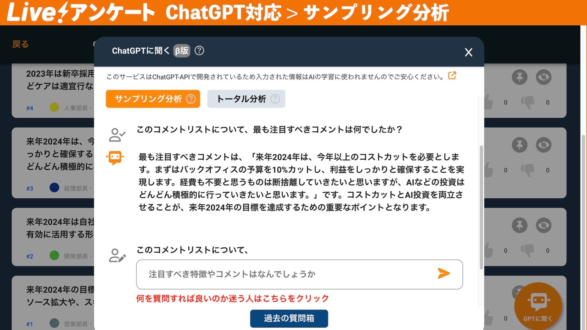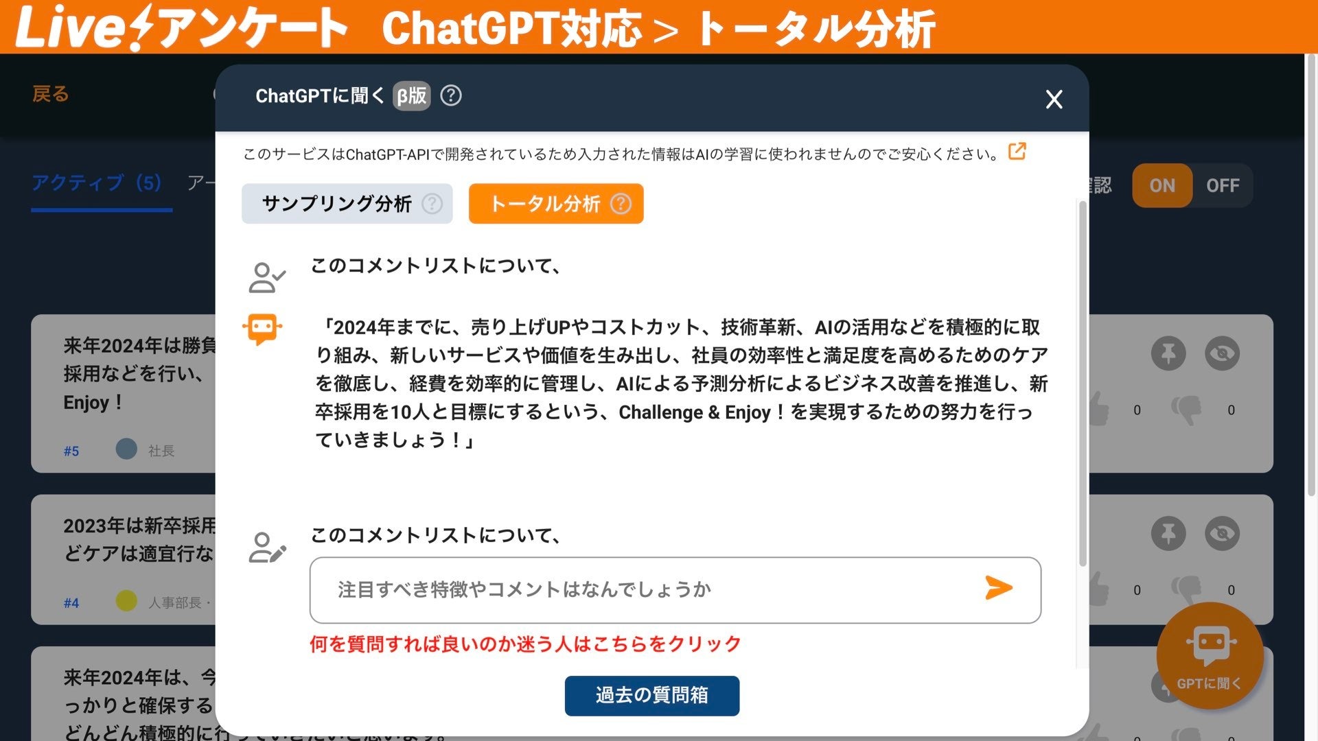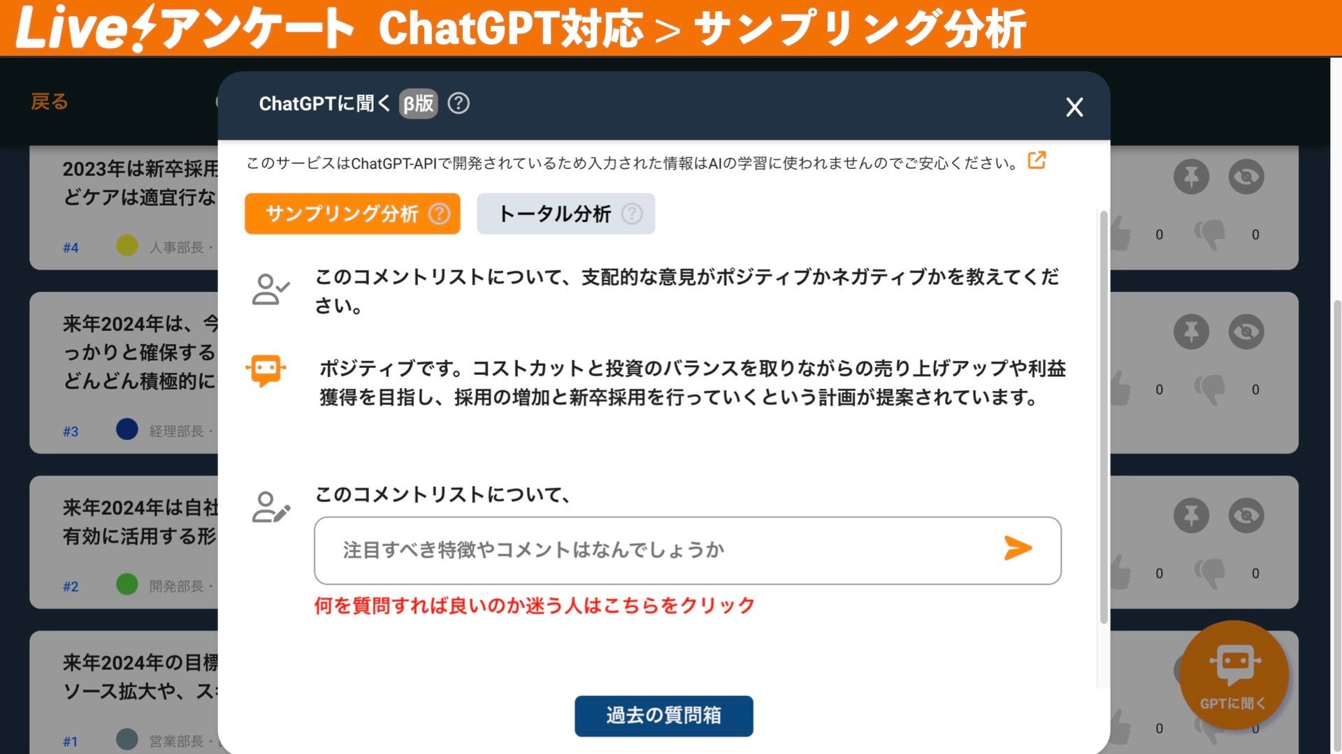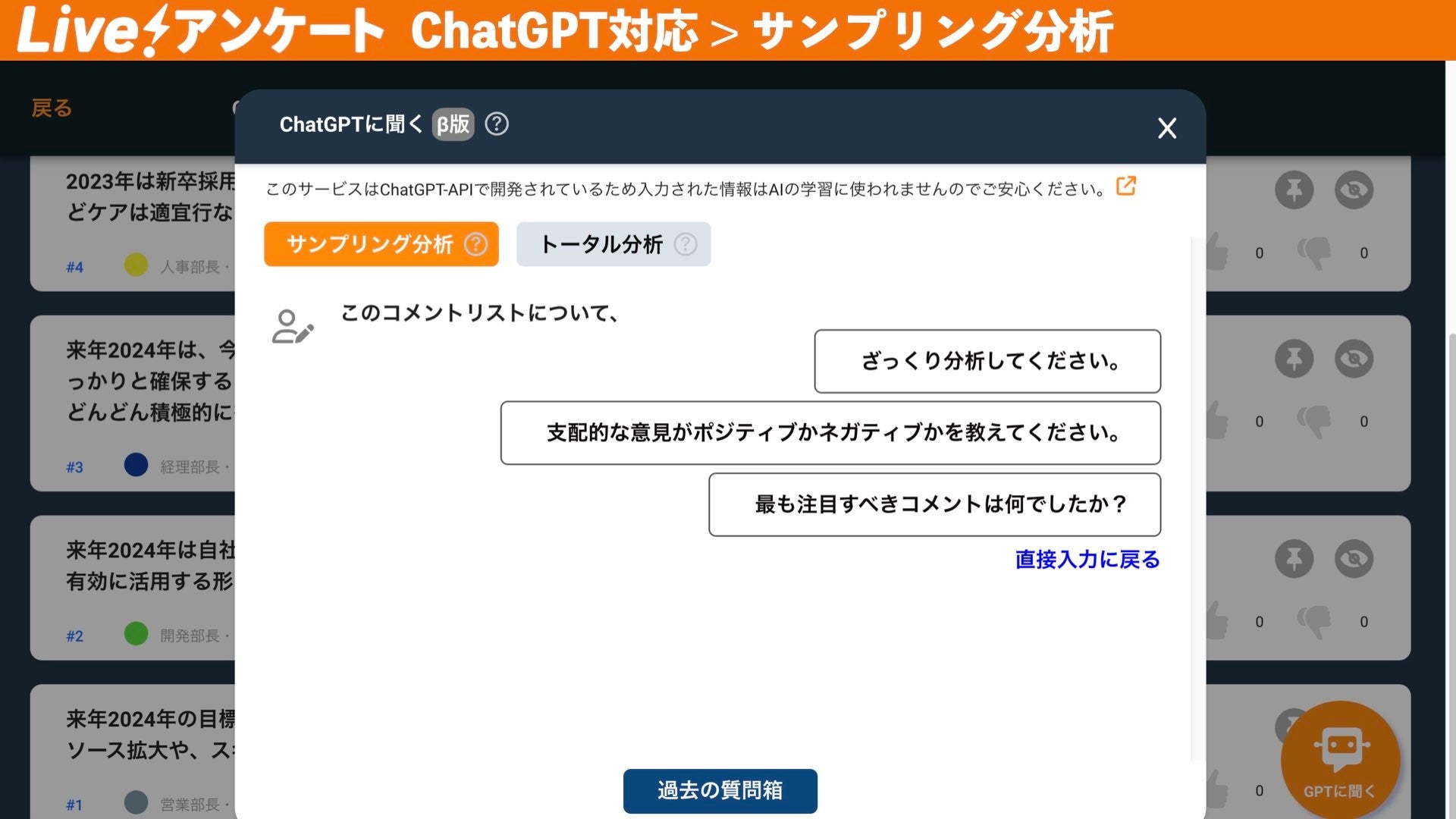【ChatGPT × Live!アンケート】リアルタイムアンケート「Live!アンケート」で参加者から集めたコメントを分析する「ChatGPTに聞く」機能が誕生!