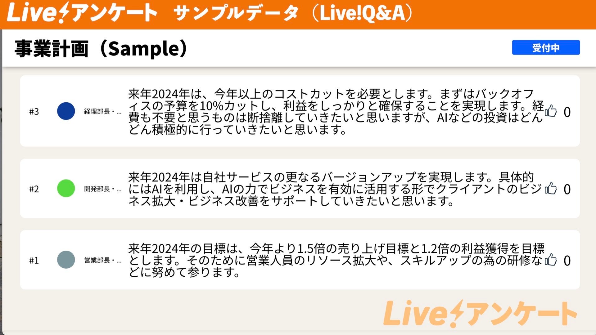 Live!アンケートに寄せられたフリーコメント(Live!Q&A)において活用が可能となります。